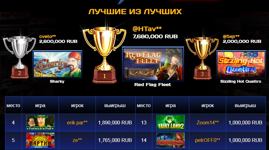 Отдельно хочу отметить превосходную службу поддержки, которая работает 7 дней в неделю, 24 часа в сутки и оперативно решает возникающие вопросы. Вкусные джекпоты, занимательные турниры — всё это ждёт тебя в проверенном временем и тысячами игроков клубе Вулкан. Ты только посмотри на выигрыши топ 5-ти лучших пользователей: